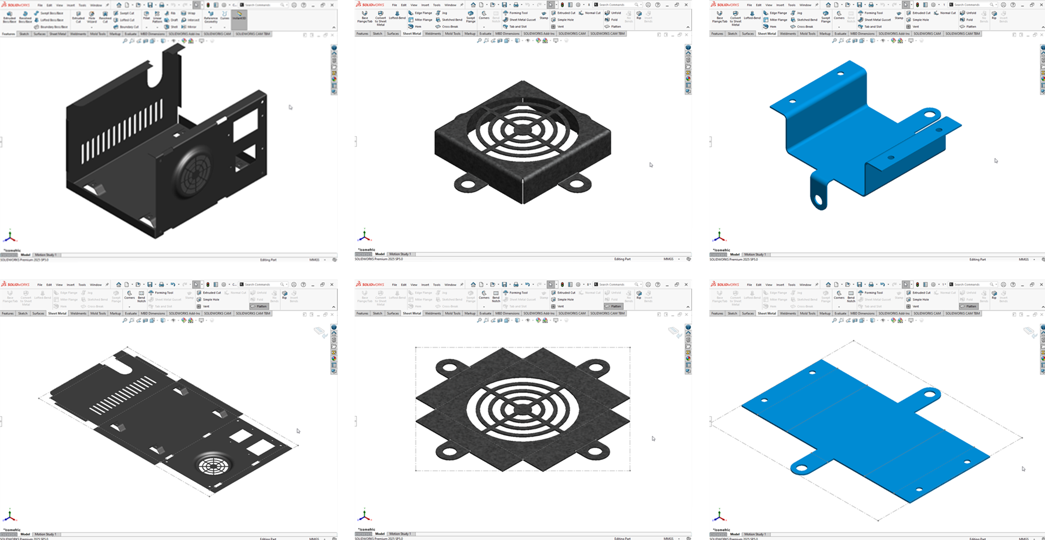 Designed a sheet metal component in SolidWorks with flanges, bends, and cuts, and created flat patterns and detailed drawings for manufacturing.