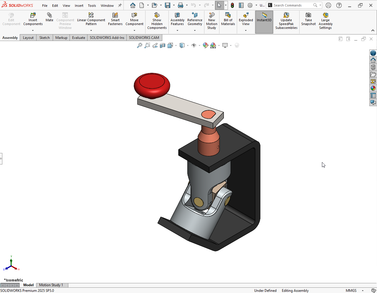 I modeled each component of the Universal Coupling Joint individually and assembled them using proper mates, then conducted a motion study to analyze rotational movement and power transmission.